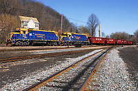 A matched set of New England Central Railroad GP38s, 3845 and 3850, are leading a Herzog "Star Wars" ballast train past a rural home in Hartland, VT on the way to dumping south from Windsor, VT as... (more)