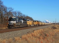 A westbound Norfolk Southern coal train led by a pair of Union Pacific AC4400CW locomotives, including a patched ex-Southern Pacific in the second position, crosses the former NKP drawbridge over ... (more)