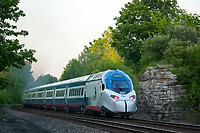 An evening Amtrak Alstom Acela equipment move (Hornell, NY to Philadelphia, PA) passes between the former West Shore RR abutments where the Rochester and Buffalo Subs meet.