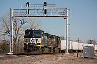 Two NS Dash 9s pull the westbound roadrailer under the new signal bridge at N.R. Junction on the east side of Emporia.