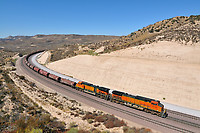 Two DPUs assist with braking on a loaded unit steel coil train, as they round the curve at Summit, and begin their decent down Cajon Pass.