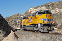 The Rock Train is slowed by the climb up to CP Crest and Soledad Canyon as it comes around a curve in Palmdale.