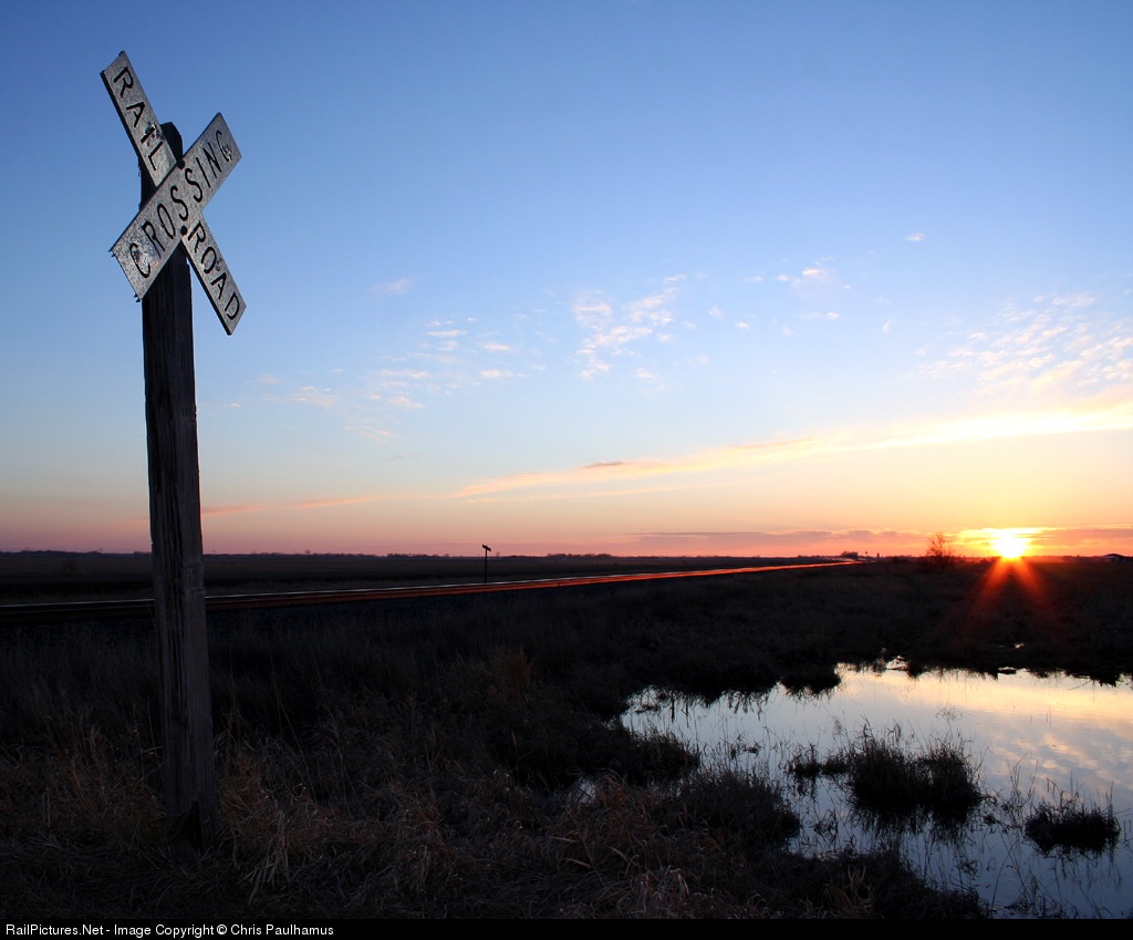 The welded rails of the Devil's Lake Sub reach toward the setting sun as a rural cross buck is left behind to deal with the impending night. Another great ND sunset...