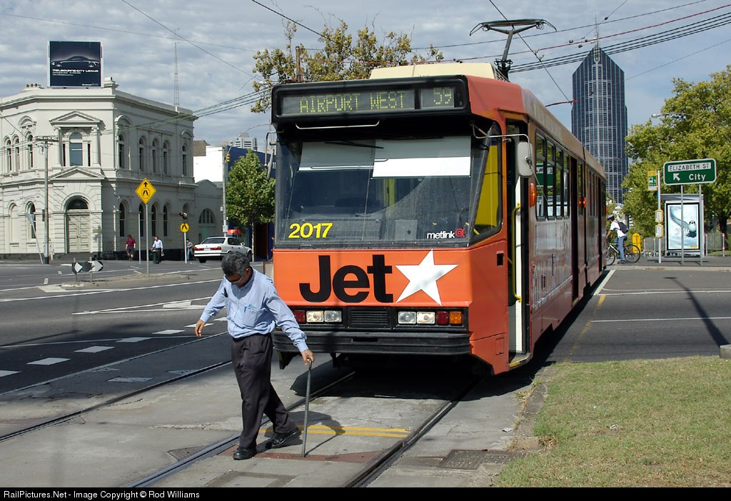 B 2017 in Qantas 'Jet Star' advertising scheme sits and waits for the driver to hand throw the switch in to Flemington Road