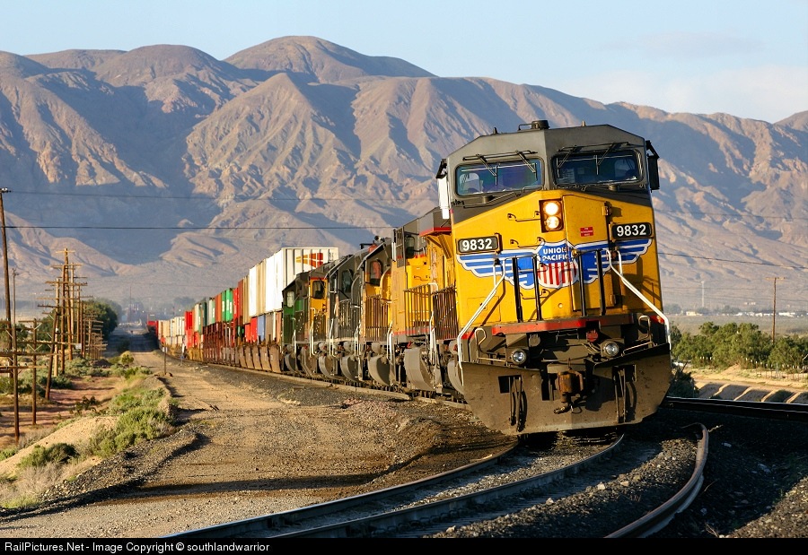| On April 9, 2005, at the UP/BNSF connection in Daggett, a very well powered intermodal headed by UP 9832 waits for clearance onto BNSF territory. |