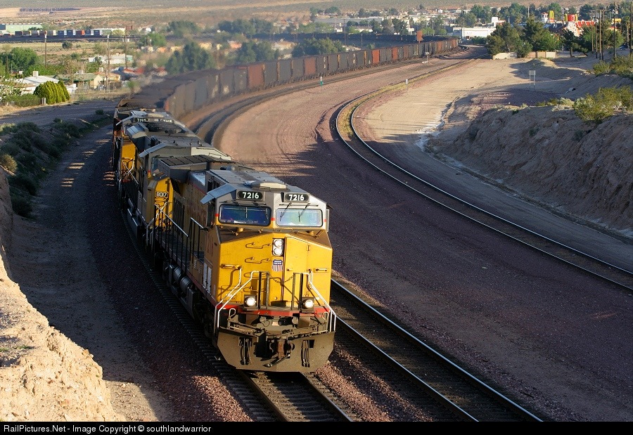 | During the late afternoon of April 9, 2005, a westbound loaded UP coal train enters Barstow led by UP 7216. |