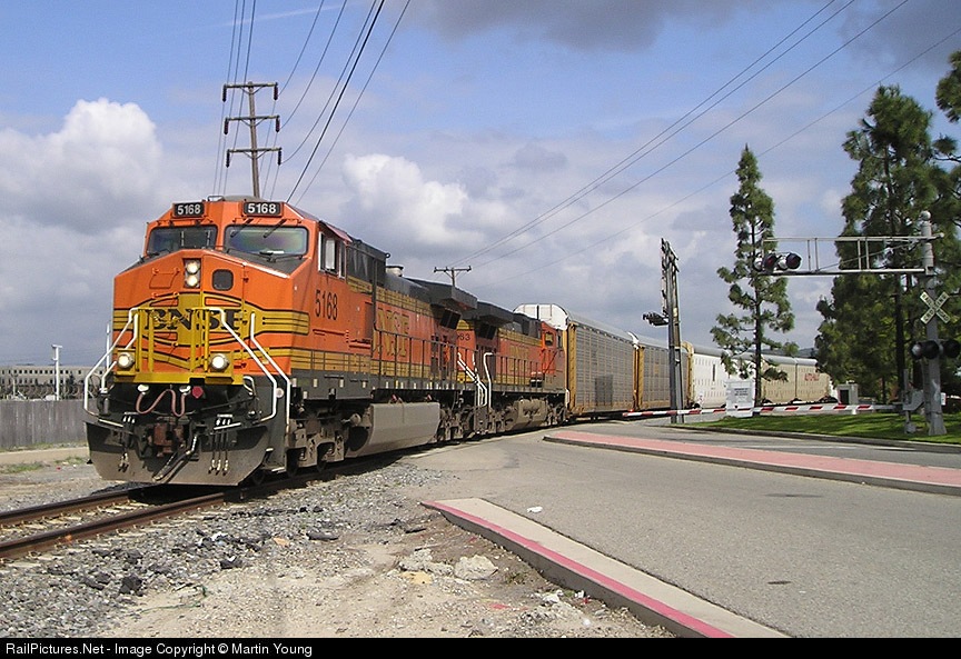 | BNSF Auto train is crossing Jefferson St in Anaheim on its way South to San Diego. The train has just entered the Olive Sub, which is owned and dispatched by Metrolink |