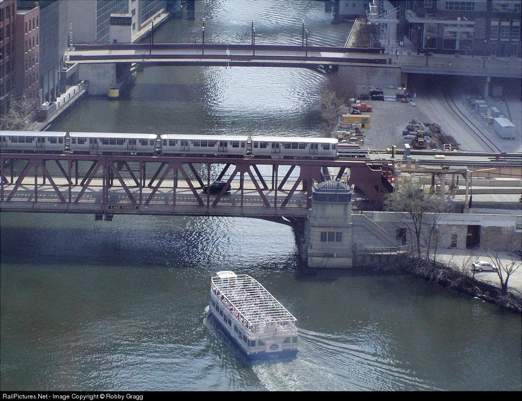 CTA 3433 leads a 4 car set of M.Us crossing the Chicago River as a Tour Boat passes underneath.