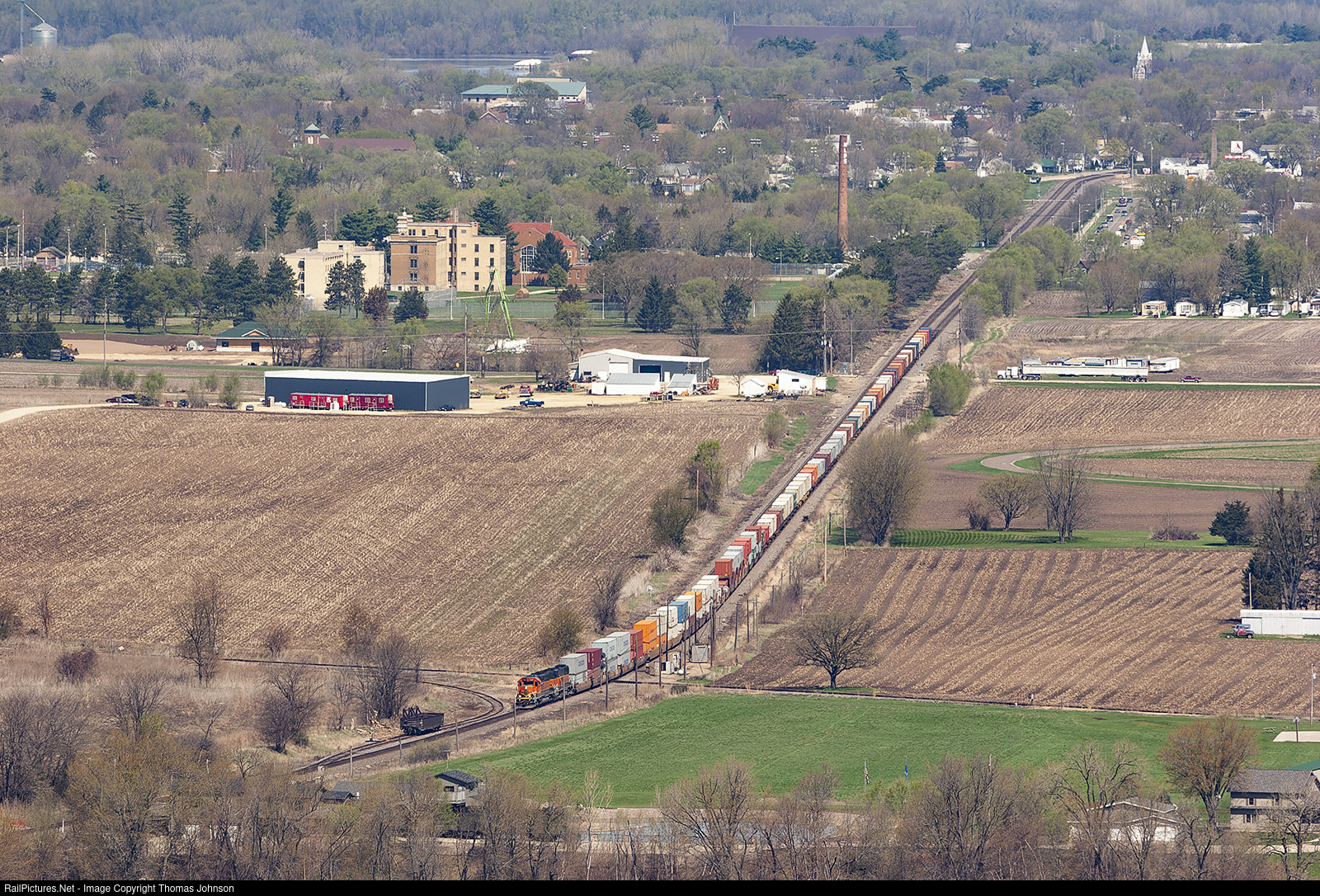 Stack train heads south (RR East) through Wisconsin's 2nd oldest town. The train has just crossed the WSOR diamond and is heading for the WI River Bridge. The semi waiting for the train to clear is carrying a piece of the new WI River Railroad Bridge.