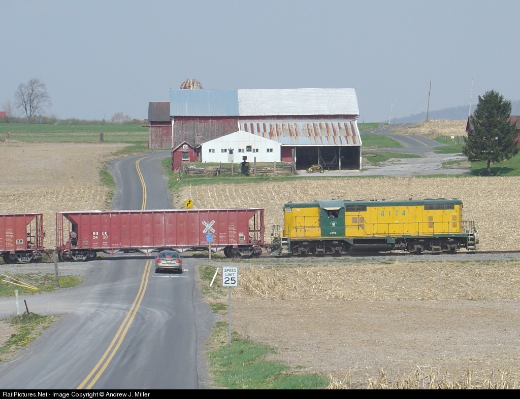 No. 4174 and a car nearly have a cornfield meet. Fortunately the car stopped before the train crossed. Train is an empty stone train on its way to a lime plant near Pleasant Gap.