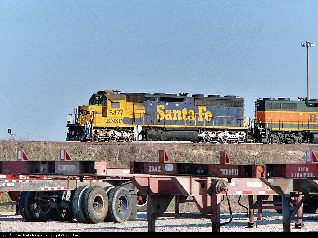 | On a cloudless day, BNSF SD45-2 5477 sails above a sea of container chassis as is swings off the wye and prepares to tie onto the drag for North Yard. |