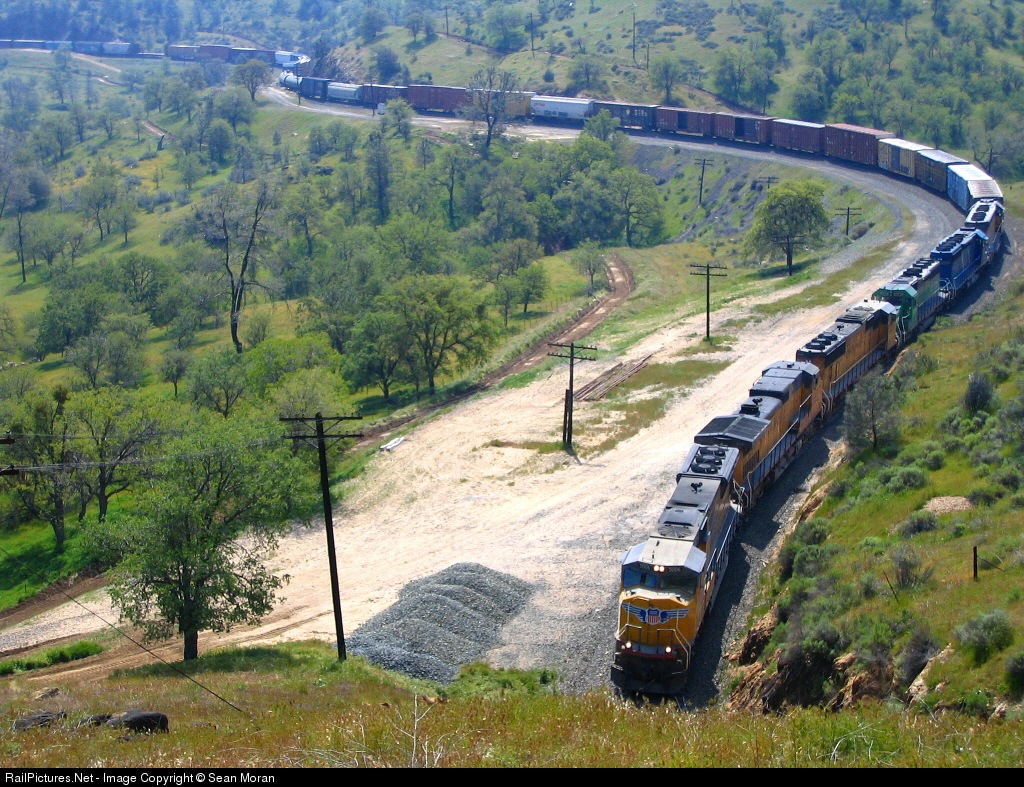 UP 5006 with a winding train above Tehachapi creek. The head end is about to enter the South portal of tunnel 10, and then wind down the loop.
