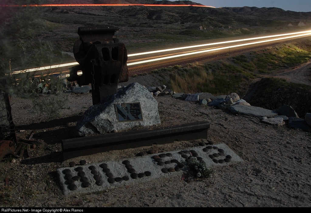 A memorial statue stands on Hill 582 on Cajon Pass as a BNSF manifest passes in the backround. Nikon D70 24-120mm. www.bayarearailroading.com