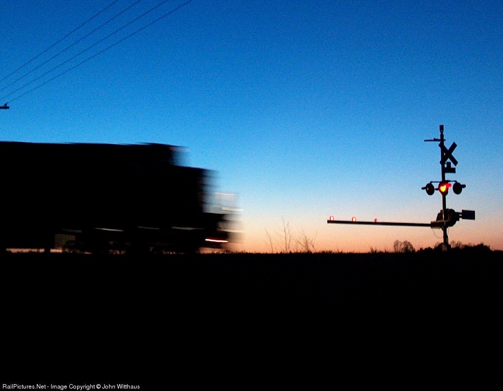 Just after the SB ore train passed, the NB counterpart flies through a rural grade crossing just after sun-down.