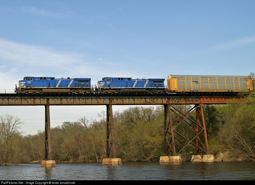A pair of leased AC44's lead a westbound CP train over the Crow River in Rockford, Mn.