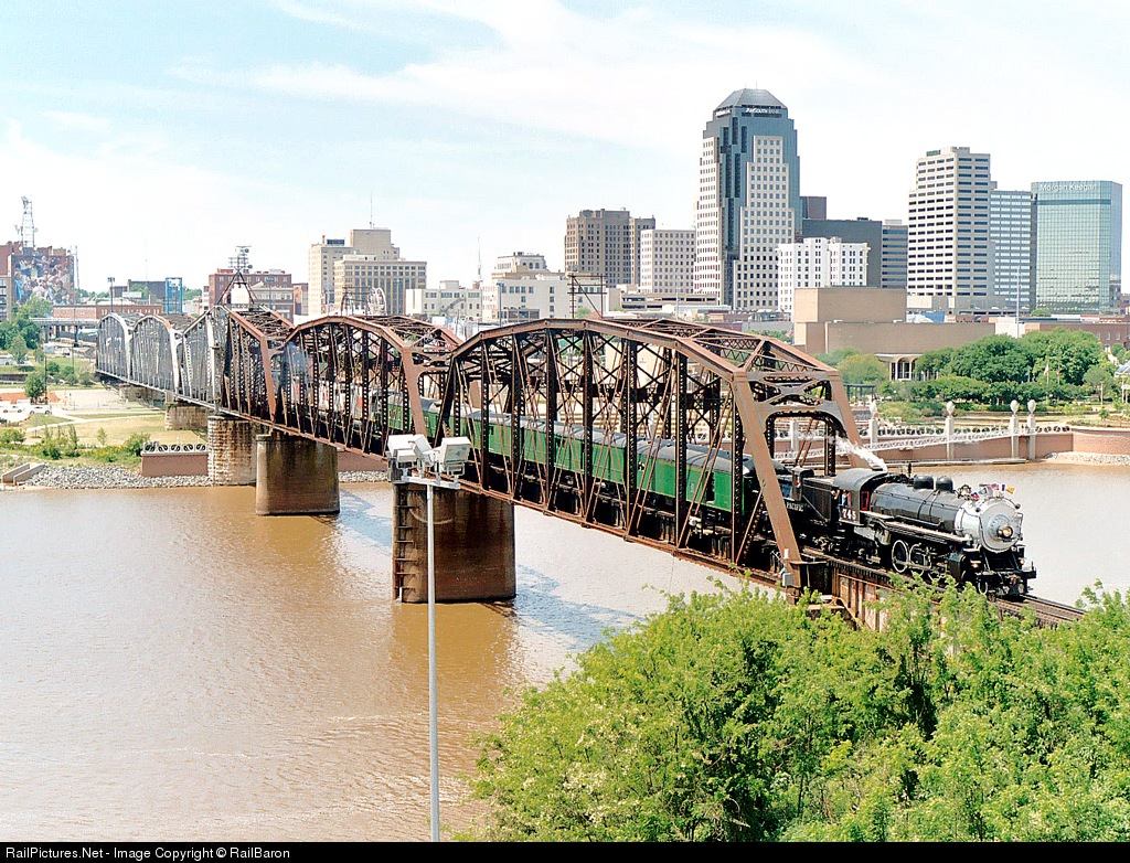 | With the Shreveport skyline across the river as a backdrop, SP 745 crosses the Red River with the LASTA train. 4 KCS motors are on the rear to provide air account a failed air compressor on the 745. |