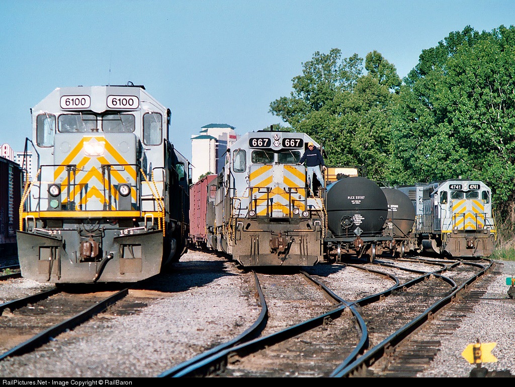 A hostler emerges from the cab of KCS 667 as he prepares to leave that power and take the 6100 set across the river to Shreveport Yard.