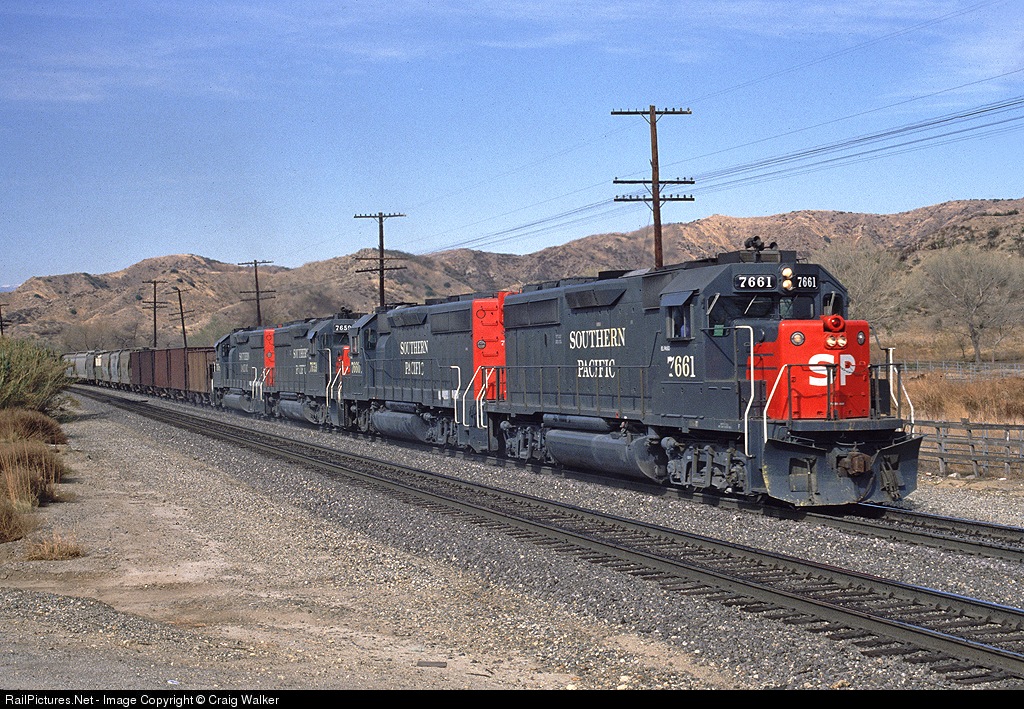 A quartet of sequentially numbered GP40-2 (7661, 7660, 7659, 7658) grind upgrade through San Timoteo Canyon on SP's Sunset Route in southern California. Some sets of power, such as this 10-month-old set, were chained together in order to ensure that the entire set was available for high priority trains and not broken up for lesser work. Click here and here to see other views of this train.