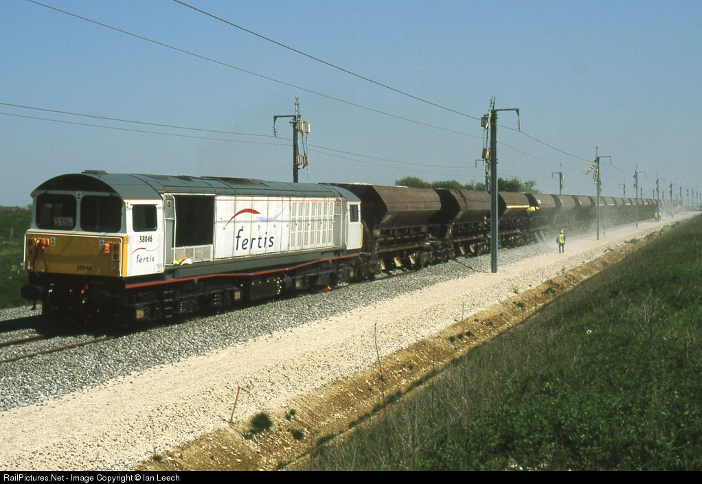 On hire from EWS, 58046 bank a train laying ballast on the new TGV-Est line. note the rear wheel of the Class 58 glowing red hot with wheel slip.