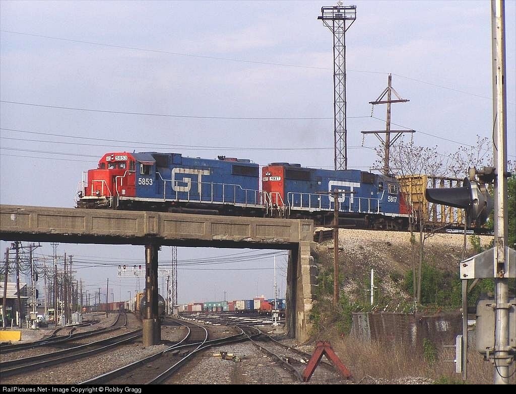 | A nice pair of GT GP38-2s, #s 5853 and 5817, head Westbound on the elevated CN Freeport Line as they head through Berwyn. |