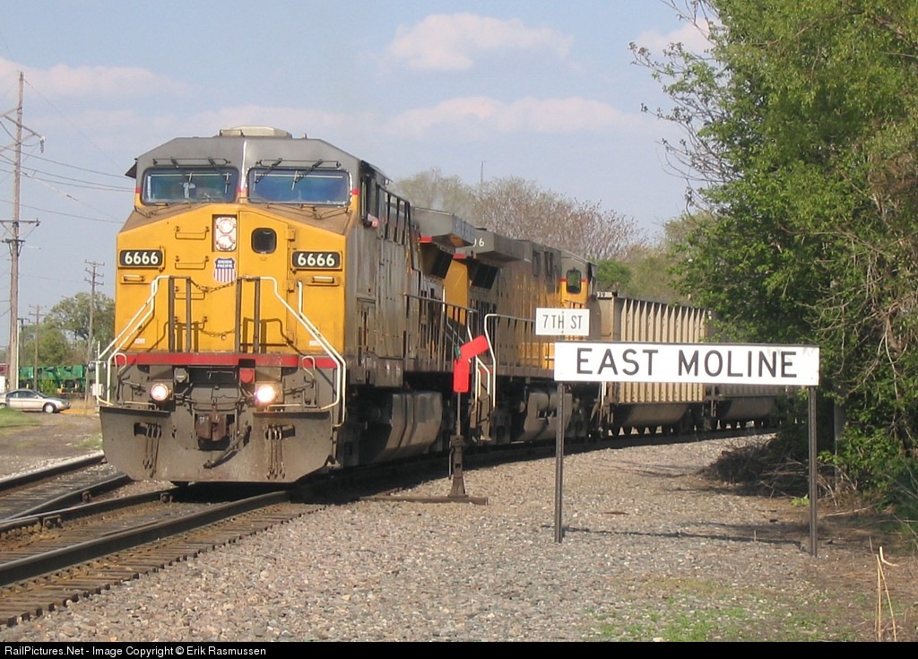 | This WB UP coal train is detouring over the Iowa Interstate from Peoria, IL to Council Bluffs, IA to avoid a big derailment on the ex-CNW at Galt, IL. |