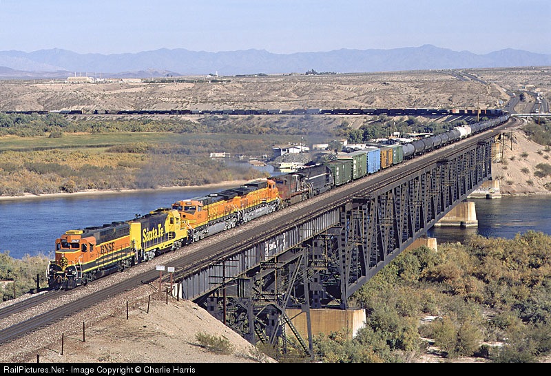 BNSF 2401 leading 5 other units across the Colorado River on a Westbound freight