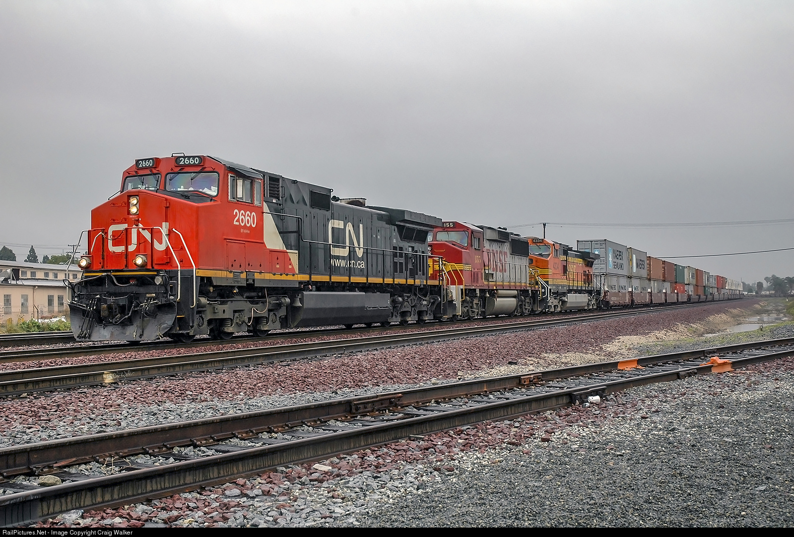 A light drizzle is falling as BNSF train S-ALTWAT1-15, heading to Watson in the Los Angeles Harbor area, holds Track 2 at Basta for the afternoon passenger rush, during which Amtrak and Metrolink trains pass by about every ten minutes. On this afternoon, this Intermodal Stack train has an interesting consist, particularly given that it originated in Alliance, Texas: Canadian National Dash 9-44CW 2660 is leading BNSF GP60M155 and BNSF Dash 9-44CW 4334. (Fullerton, California – March 19, 2005)