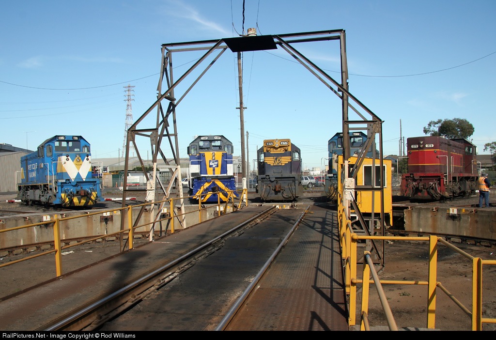 Looking across the turntable at T385 in West Coast Rail T387 in CFCLA T320 in its original Victorian Railways T369 also in WCR and T373 in Great Northern colours