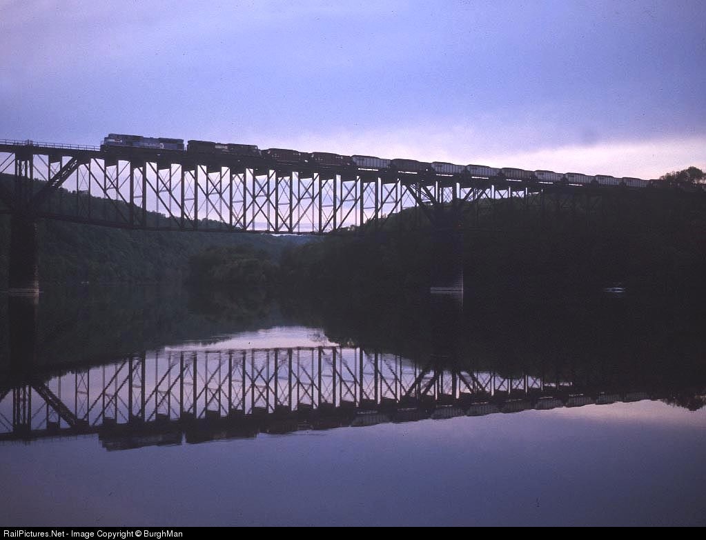 At dusk, a northbound NS Shelocta coal train crosses the B&P's Allegheny River Bridge