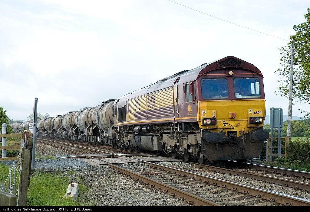 66011 at Micklewood crossing with the 6M68 (SO) Burngullow-Irvine china clay slurries. Check out that bent frame! Back to EMD in Ontario?