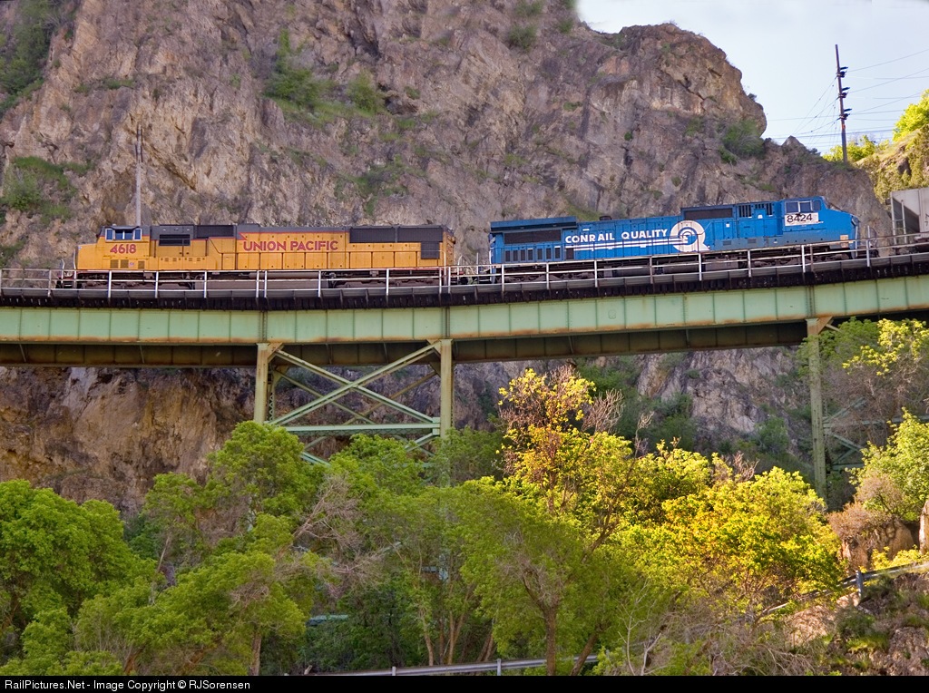Working their way down the slight grade on the Big Trestle, UP 4168 and a blue Conrail 8428 prepare to enter the lone tunnel along this section. Staying close to the Bear River on a rock shelf they will continue north towards Cache Junction.