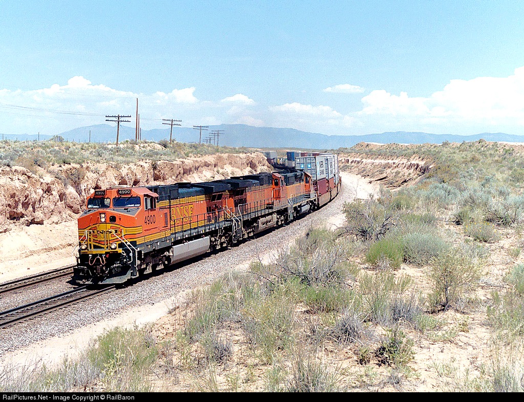 | BNSF 4900 has successfully lifted this stack train uphill from Belen to Dalies and now begins to accelerate vigorously as it drops down toward Rio Puerco on the Transcon. This is a Barbours Cut, Texas to Los Angeles Harbor APM Terminal train. |