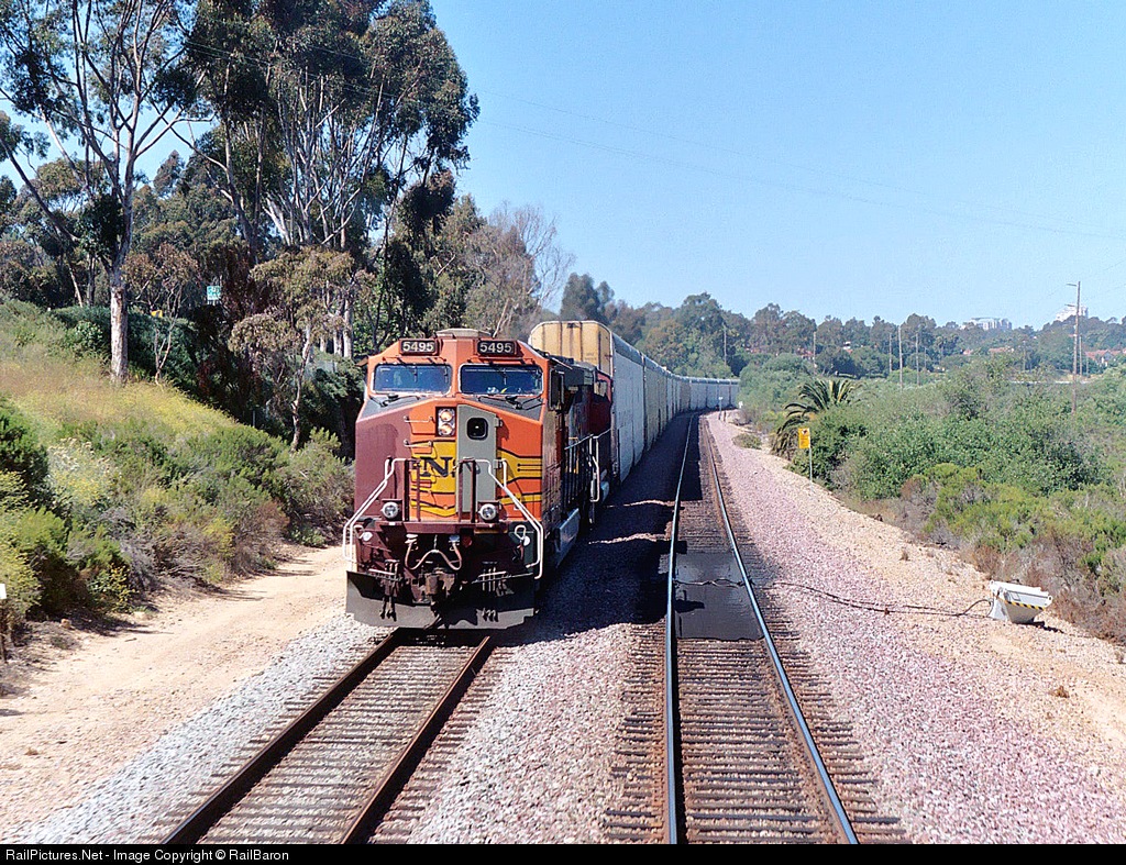 | Shorlty after our departure from San Diego on Surfliner 583, we meet a BNSF vehicle train led by a hastily reparied 5495 and GP60M 106. This San Bernardino to San Diego vehicle train has 61 empty autoracks (45 lines). |