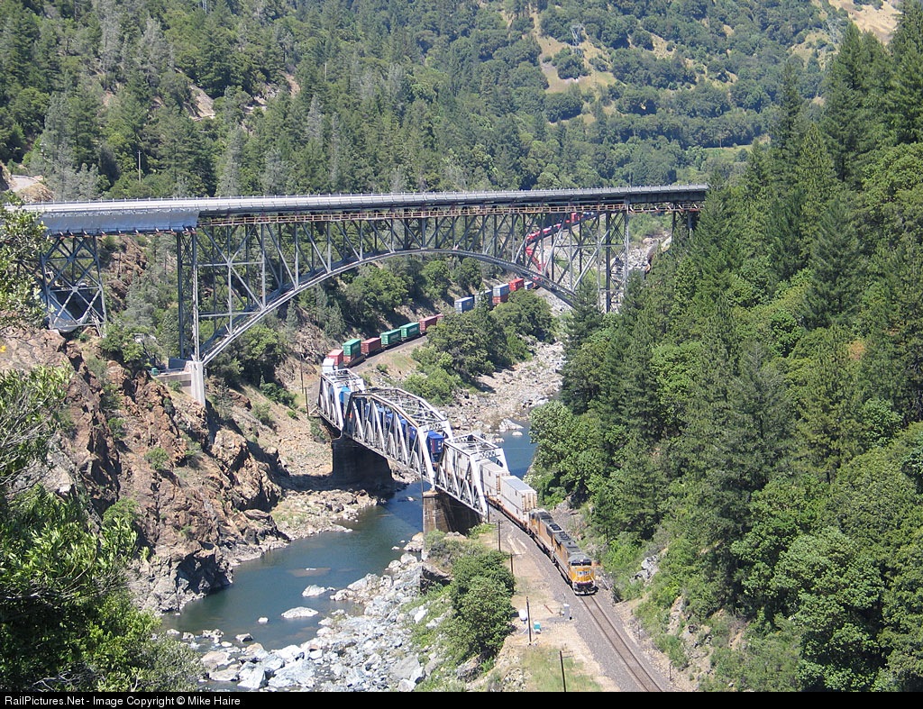 UP 5209 stacktrain crosses over the Feather and under Hwy 70 heading west.