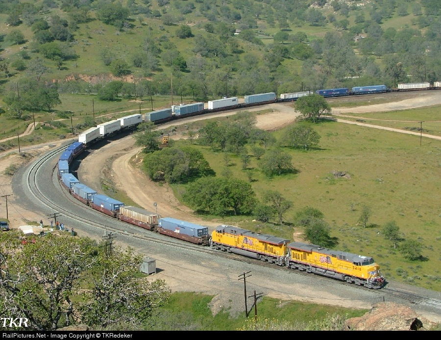 Brand new GEVO's UP 5418 & 5420 lead a southbound intermodal around Tehachapi Loop.