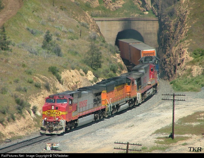 BNSF 713 leads a southbound intermodal out of Tunnel #9 and through Burtons Curve on a sunny April morning.