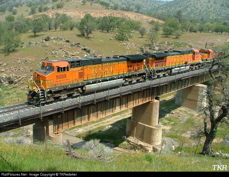 A northbound glides over the Tehachapi Creek bridge behind BNSF 5038.