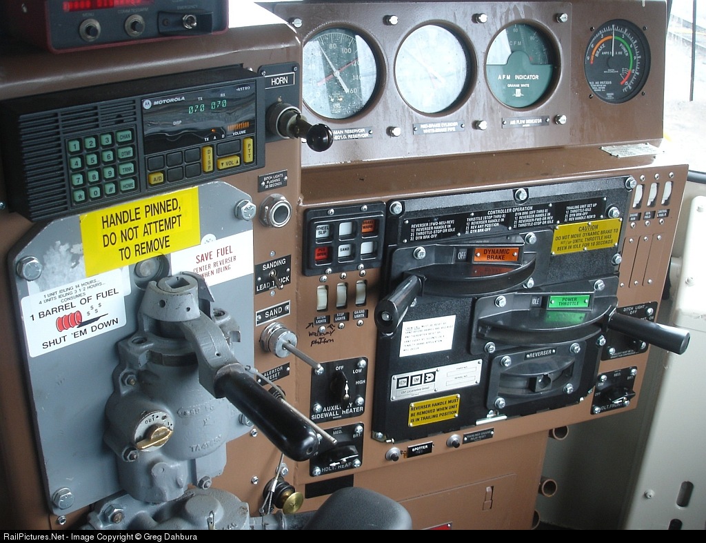 | The cab of a brand new, never in service locomotive. Smelled like a new car. This loco began its days as a Southern GP50 but very little, only the frame and trucks and a few other things remain. |