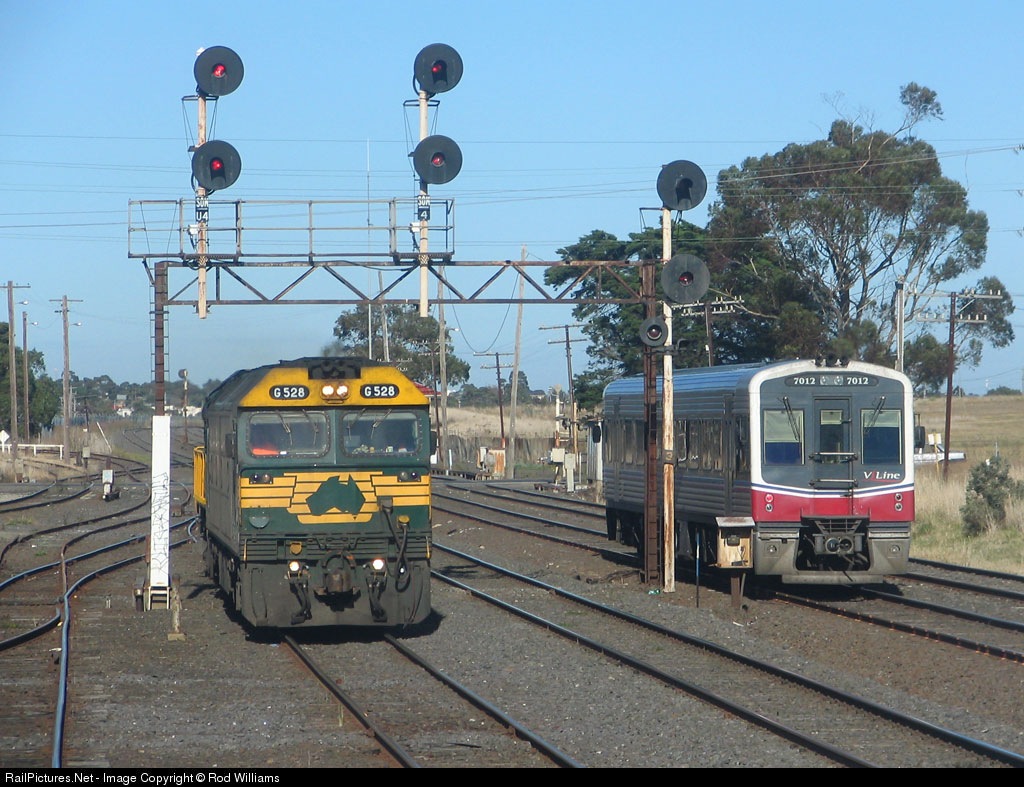 528 arriving into number 2 on the standard gauge as a sprinter rushes by on the Victorian 5'3" track