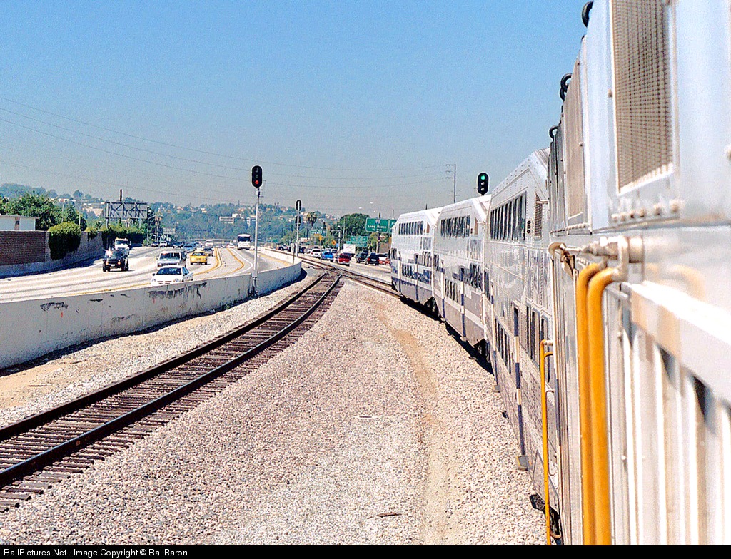 | Looking from the engineer's window on Metrolink 853, we can see that the cab control car is about to take our clear signal at speed as we prepare to overtake all of the citybound traffic on the I-10 Freeway ahead. |