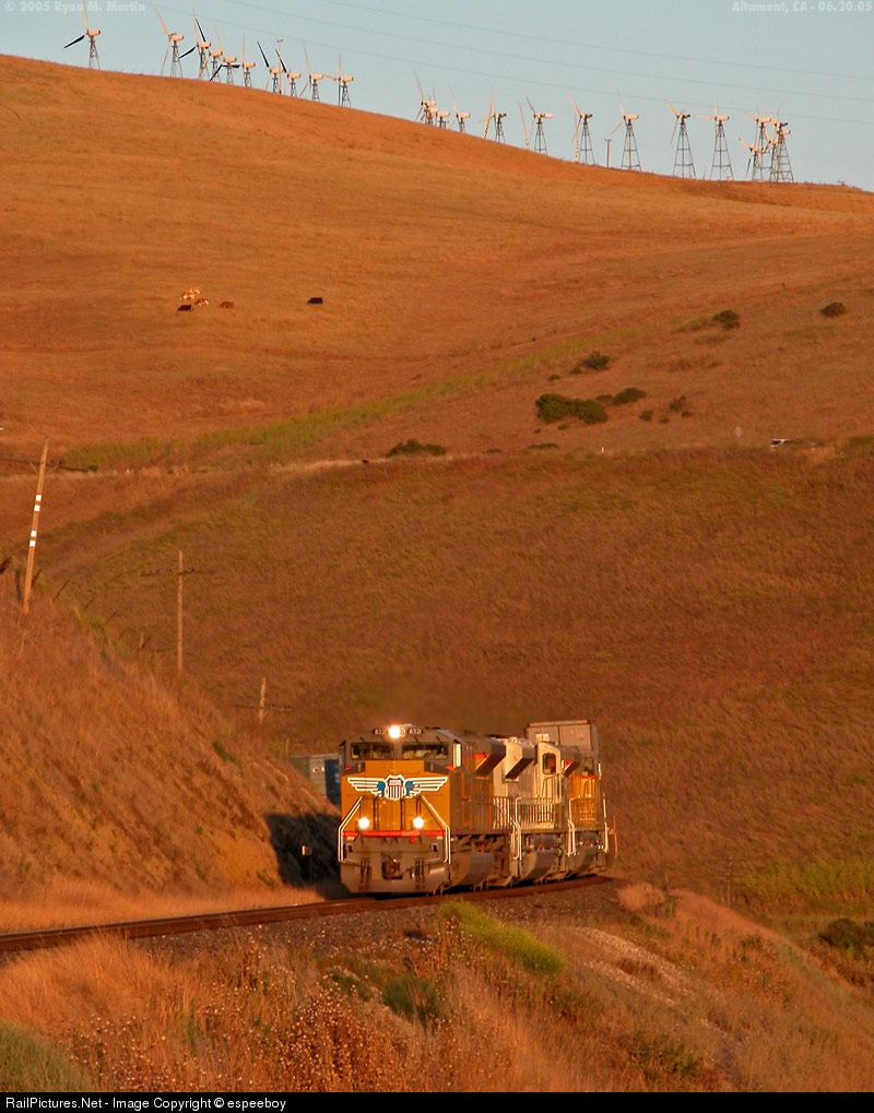 | A few miles west of Altamont, our Oakland bound stacker led by UP8321 is coming down the west grade of Altamont around into the sun again. A slow order at Summit almost allowed the sun hitting the hill ridgeline to ruin the shot, |