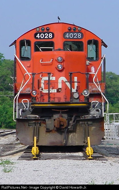 | CN 4028 heads up the deadline of GP9's at Woodcrest...Note: Bird perched atop cab! Now the CN 4028 works with the CN 4000 switching North Fond du Lac, WI yard. |