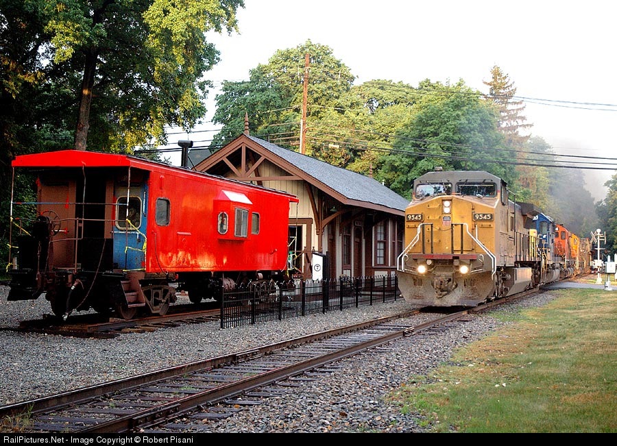 | A CSX SD40-2, 2 MLW M-636s and a CSX SD50 round out an unusual consist. Former PC/CR N-12 caboose #24542 is on display next to the restored station. For more information, please see http://www.maywoodstation.com/ |