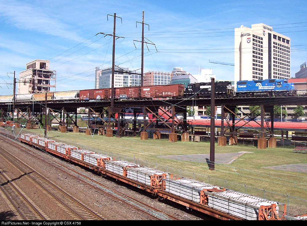 Former Conrail geep leads NS local H5A west out of S. Philly Yard over the high line; the remains of the civic center tower to the left rear.