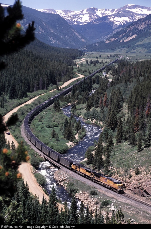 Snow still lingers on the Colorado Rockies as another coal load descends the Moffat Tunnel line. UP is looking at replacing the wooden trestle under the second hopper.