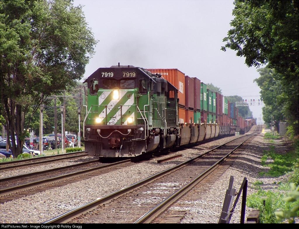 | A pair of BN SD40-2s, lead by 7919, lead a long Westbound Stacker through Brookfield. |