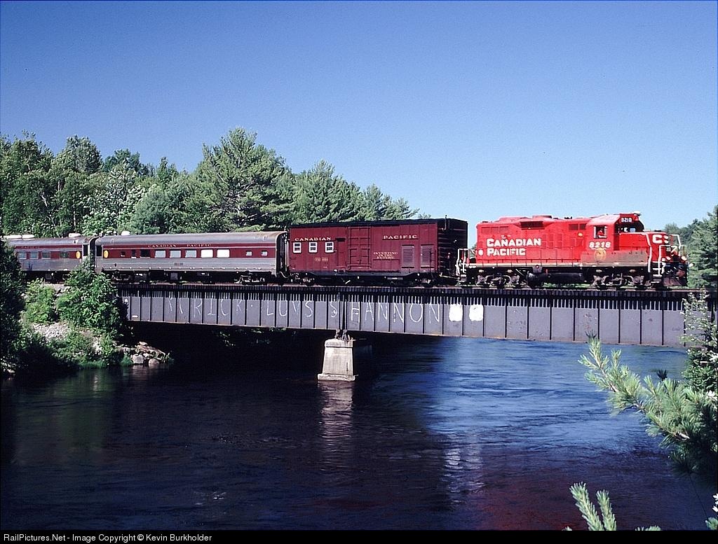 | Montreal Maine & Atlantic annually contracts with Canadian Pacific Railway to have the track geometry checked via CPRs Geometry Train. On July 7, CP GP9 8218 heads across the Elbow Lake/Quakish Lake spillway bridge. |