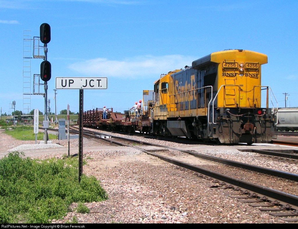 A former Santa Fe unit unloads welded rail in BN territory, in preparation for an additional mainline. UP Junction is aptly named for its wye connection with the Union Pacific. The small UP yard nearby is now abandoned, but the name is certain to remain.