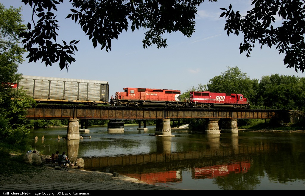 | Canadian Pacific westbound train X747 crosses the Kalamazoo River bridge in New Richmond Michigan on it's Detroit to Chicago run through over CSX former Pere Marquette main. Camera: EOS1Dmk2 with 28-70mm f2.8, ISO 100, 1/500 @ f5.6 |