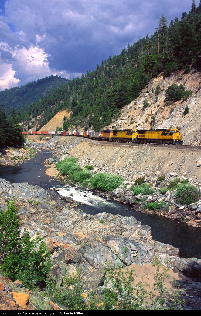 A WB Z train, lead by a pair of CNW Dash 9's, makes it's way down grade through Serpentine Canyon. In the background, a violent summer t-storm is brewing, and chatter on the scanner from other trains made it sound pretty wild to the east.
